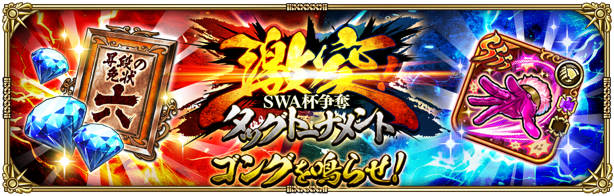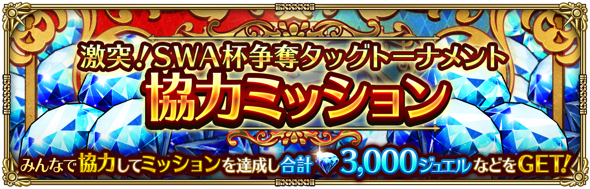 期間限定イベント「激突!SWA杯争奪タッグトーナメント」で獲得できるレッドマスク、ブルーマスクを集めて、みんなで協力して全体ミッションを達成しましょう。ミッションクリアで、合計3,000ジュエルなどの報酬を獲得できます。